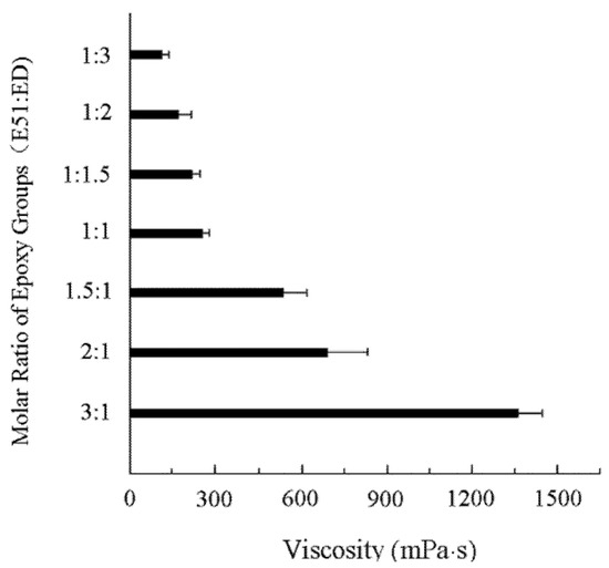 As shown in Figure 1, with the increase of ED addition, the viscosity of the initial reaction system became smaller and smaller. The measurements showed that the viscosity of the reaction system without ED was 8326.80 mPa·s. When the molar ratio of the epoxy groups of E51 to ED in the system was 1:1, the viscosity of the initial reaction system decreased greatly: the viscosity of the initial reaction system was 271.15 mPa·s and the viscosity reduction rate reached 96.74%.