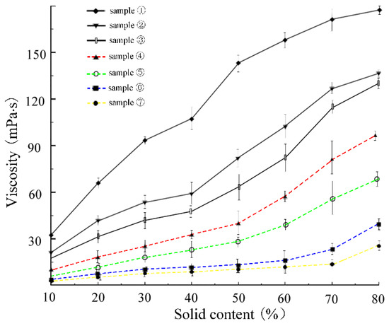In order to verify the effect of the viscosity of the initial reaction system on the viscosity of the final synthetic coatings, eight groups of waterborne coatings with a solid content of 10~80% were prepared using the different proportions of E51 and ED. Their viscosities were tested to examine the effects of different proportions of E51 and ED on the viscosity of the prepared coatings. The results of the test are shown in Figure 2.
