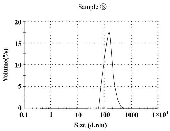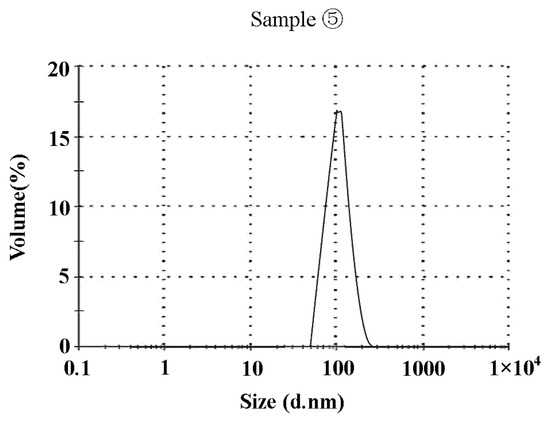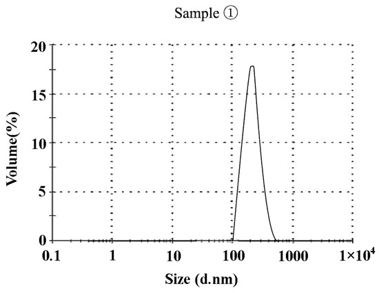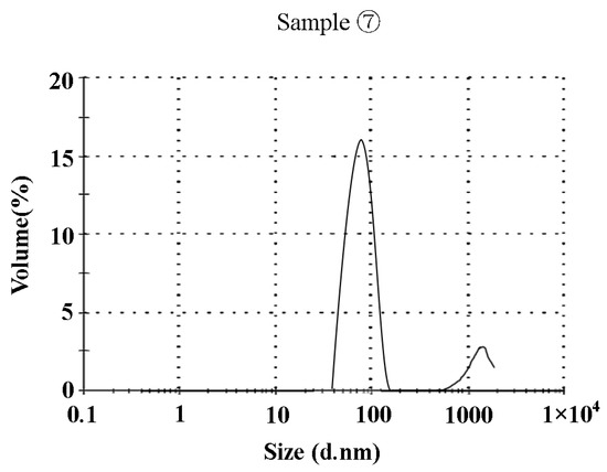 For the inkjet system, due to the requirements of the precision of the nozzle, the appropriate particle size of the coatings has a great influence on its range of use and performance. In this experiment, particle sizes of the coating samples 1–7 were tested to explore the influence of the ratio of E51 to ED on the particle size of the system. The self-made synthetic coatings were tested to determine whether they could be applied to the inkjet system. The test results of the particle sizes of the coatings are shown in Figure 3, Figure 4, Figure 5, Figure 6, Figure 7, Figure 8 and Figure 9.