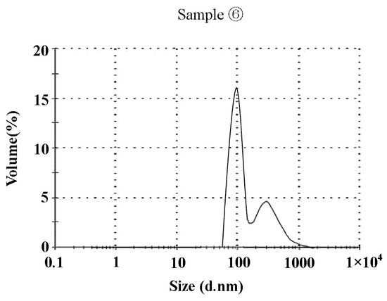 As can be seen from Figure 3, Figure 4, Figure 5, Figure 6, Figure 7, Figure 8 and Figure 9, the overall trend of particle sizes of the coatings system prepared in the experiment was getting smaller and smaller with the increase of the dosage of ED. The particle sizes of samples 1–3 were about 300–400 nm, and the particle sizes of samples 4 and 5 were about 100–200 nm. The peak heights of samples 1–5 were high and narrow, while the particles of the coatings were uniform in size and concentrated in distribution.