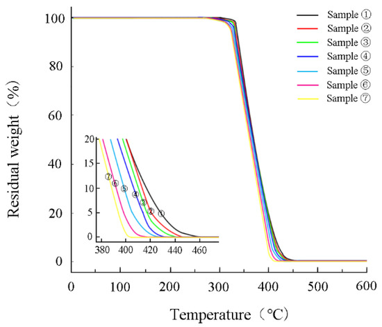 It can be seen from Figure 10 that the synthesis had an obvious weight loss step at 330~430 °C, which indicated that the molecular chains in the synthesis had been decomposed at this stage. With the increase in ED ratio, the TG curve shifted to the left, especially for samples 5–7, which meant that its thermal stability performance decreased significantly.