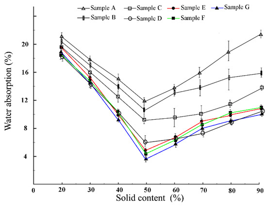 The prepared coating samples A–G were diluted to different solid contents for drying and curing, and their water absorption was tested. The results are shown in Figure 11.