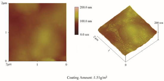 The left hand images in Figure 14, Figure 15, Figure 16 and Figure 17 show the base paper surface covered by the coatings. The right hand images in Figure 14, Figure 15, Figure 16 and Figure 17 show the flatness of the paper surface and the changes in the paper surface after being coated. As can be seen from Figure 14, the surface of the packaging base paper had many pores and was clearly uneven. When the coating amount on the surface of the base paper was 1.51 g/m2, as shown in Figure 15, the coating filled the pores of the paper, which effectively improved the roughness of the surface of the coated base paper. However, the surface could not be completely covered by the coating film in some areas of the base paper at this time because of the low coating amount. In addition, the coating thickness on the paper surface was uneven, as shown on the three-dimensional diagram. As can be seen from Figure 16 and Figure 17, when the coating amount increased to 2.55 g/m2, the paper surface was covered by a uniform coating and was quite flat. There was no obvious difference between the morphology diagram and three-dimensional diagram obtained by AFM when the coating amount was increased to 3.60 g/m2. At this time, the effect of increasing the coating amount was mainly reflected by an increase in the film thickness.