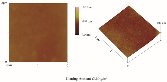 As can be seen from Table 4, as the coating amount increased, the roughness of the paper surface decreased significantly and the paper surface became smoother and smoother. However, the speed of this smoothing trend became increasingly smaller. When the pores on the paper surface were filled with the coatings and a uniform coating film had been formed, increasing the coating amount had no obvious effect on improving the smoothness of the paper surface, but only increased the thickness of the coating layer. These results were consistent with the results of the SEM and AFM analyses.