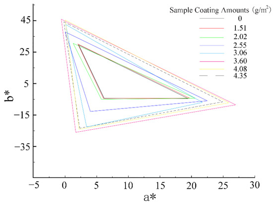 In order to evaluate the influence of the coatings on the color reproduction performance of paper, the CIE L* a* b* values of uncoated and coated printing samples were measured by a spectrophotometer. According to the measured values, the color gamut map of each printing paper was drawn, and then the color reproducibility of the samples was evaluated.
