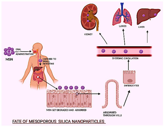 The physiological barrier function that prevents ghosts from entering the body is directly related to the absorption of nanoparticles in the body at first. Skin and the gut, as two of the body’s principal natural physiological barriers, can efficiently protect the body from harmful infections and chemicals. Nanoparticles, on the other hand, are largely believed to be absorbed by the gastrointestinal epithelium. Furthermore, numerous prior research has found that the particle sizes of nanomaterials that enter the body through the intestine have a significant impact on their penetration [72]. MSNs are a promising nanomaterial for biomedical applications; however, their interaction with the body remains poorly understood. The absorption, distribution, and excretion of MSNs following oral administration, which are the two primary methods for MSNs to be used in biomedicine, are illustrated in the Figure 7. Furthermore, MSNs can be coated with other biocompatible materials. MSNs may be combined with other materials to form hybrid nanoparticles capable of medication delivery. However, the rapid growth of MSNs has expanded the gap between their fabrication and the relatively sluggish progress in understanding their biological impacts, which must be addressed in the future.