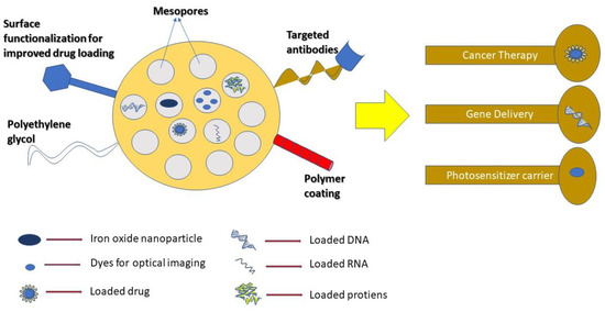 MSNs have very unique properties that make them perfect nanocarriers for hosting, protecting delivering of the drug to the specific site. The mesoporous silica surface is loaded with targeting agents which is viable for transporting them to the defective tissues which also increases the targeting and will reduce the unwanted side effects [75]. The majority of studies using mesoporous silica nanoparticles concentrated on cancer treatment [12].