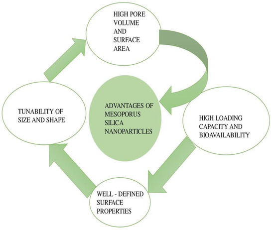 MSNs have quite good physicochemical properties and are tunable. The high porosity of MSNs allows the lodging and release of a wide range of biomolecules and medicinal substances. In addition, the multiplicity in shape, texture, and size of MSNs boosted their use as controlled nanocarriers in drug administration. MSNs with various particle sizes, pore diameters, differentiated pores (parallel channels or radial pores) may thus be created using magnetic nanoparticles implanted in the skeleton or even the mesoporous net out of discrete metal nano part centers. Self-assembled surfactant molecules are used as condensation templates to make bulk mesoporous materials. These types of MSN can be synthesized by implanting magnetic nanoparticles in the skeleton or even the mesoporous net from discrete metal nano part centers. To create bulk mesoporous materials, self-assembled surfactant molecules are used as condensation templates. Removal of the template leads to a material filled with network cavities with orderly distribution of pores with a homogenous size ranging from 2 to 20 nm, a high pore volume (approx. 1 cm3·g−1), a large surface area (approx. 1000 m2·g−1), and a high silanol density that may promote subsequent functional activities. These characteristics make MSMs attractive as candidates for applications requiring adsorption of molecules, for example, drug delivery devices, as suggested for the first time by the Vallet–Regí group in 2001 [4,21]. MSN is considered a good drug vehicle because of its textural characteristics that enhance drug loading inside pores. Conversely, the kinetics of drug diffusion may be influenced by the silanol group functioning [22]. The unique properties of mesoporous silica nanoparticles are: readily adjustable particle size, high stability and rigid framework, pore size that is readily adjustable and uniform, high pore volume and bigger surface area, bifunctional surfaces, ease of manufacturing. [13] MSN size, surface charge, and material composition have a significant effect on the cellular permeation and efficacy of MSN-based oral administration [23].