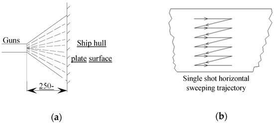 The spraying area, spraying distance, and “zigzag” spray trajectory of the hull outer plate surface in the dock are shown in