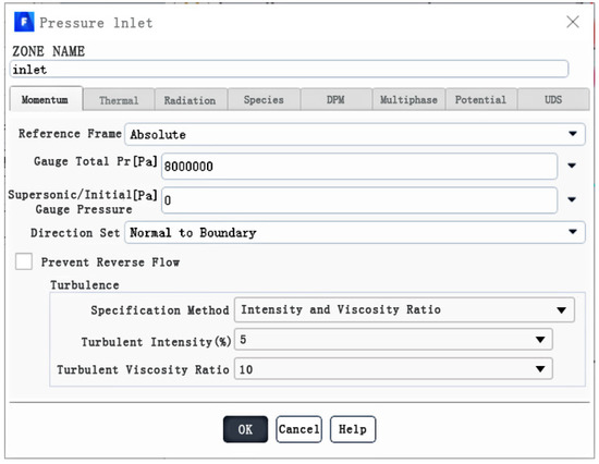 Boundary condition setting: click on the entrance, edit the pressure entrance, because this paper simulation using pressure 6–20 MPa for analysis, the example using 8 MPa solution, converted into Pa to fill in the total pressure.The outlet is the pressure boundary condition, according to the default setting, and finally set the boundary condition of wall and symmetry boundary, here also choose the default setting. The pressure inlet settings are shown in