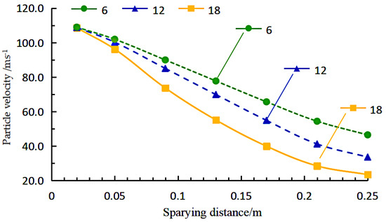 The velocity of the paint droplets affects the impact kinetic energy of the paint, therefore it is necessary to analyse the velocity of the atomised particles. The impact kinetic energy is related to the impact strength of the paint on the wall; too much speed will increase the kinetic energy of the paint, resulting in the paint colliding with the outer hull plate and then splashing, thus reducing the deposition rate, resulting in waste of paint and environmental pollution problems. The relationship between the axial velocity of the paint and the spray distance of the paint particles is shown in