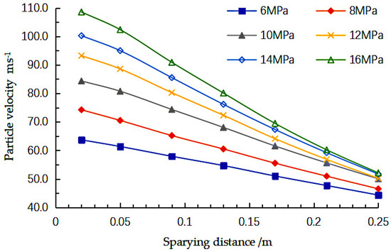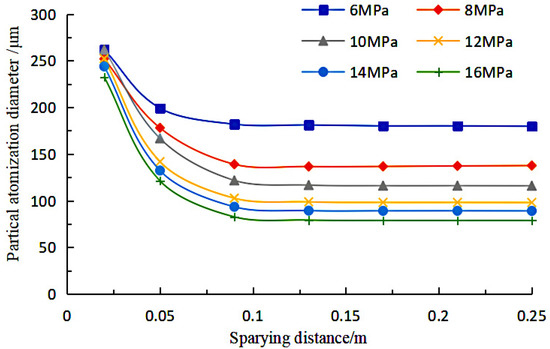Figure 16. As can be seen from the curve, the curve down section that is the first stage of coating atomisation length is gradually lengthened with the increase in spraying pressure. When the atomisation pressure is 6 MPa, the length of the first stage of coating atomisation is only about 0.07 m, and when the pressure grows to 10 MPa, the atomisation area increases to about 0.1 m.