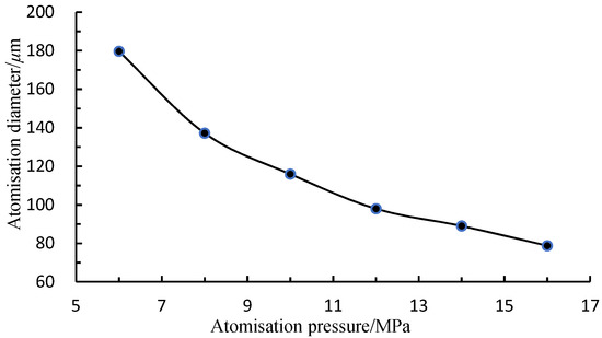 With the increase in atomisation pressure, the droplet diameter in the fully atomised state decreases rapidly. The atomisation effect is more obviously affected by the atomisation pressure when the atomisation pressure is 6–10 MPa. When the atomisation pressure increases to more than 10 MPa, the atomisation diameter of the coating decreases at a slower rate by continuing to increase the atomisation pressure.