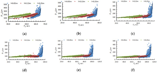 Figure 20 analyses the relationship between particle velocity and particle diameter for different pressures and spray distances of 0.05, 0.13 m, and 0.25 m, respectively.