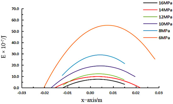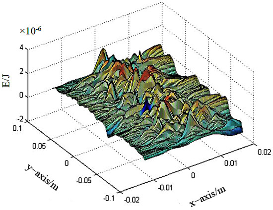 Figure 24, the impact kinetic energy of the coating sprayed on the outer plate gradually decreases with the increase in spraying pressure, and at the same time, the decrease rate of the impact kinetic energy of the droplets also slows down. Combined with the collision fracture model, the theoretical spraying deposition rate increases gradually with the increase in atomising pressure. The droplet impact kinetic energy distribution is radial symmetric, and the impact kinetic energy is large near the axis and low near the edge of the spraying area. No deviation occurs in the fitting, indicating that the droplet distribution is affected very little by gravity in the spraying atomisation process. When the spraying pressure is below 10 MPa, the impact kinetic energy of the coating gradually decreases along the radial direction from the axis to both sides. When the spraying pressure is above 10 MPa, the droplet impact kinetic energy in the vicinity of the axis remains consistent, and then decreases at the edge of the spraying area.