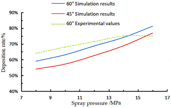 The results of calculating the coating deposition rate at different spraying pressures at a spraying speed of 0.5 m/s, while comparing the atomised spraying diffusion angle of 45° and 60°, are shown in