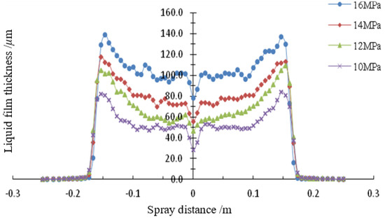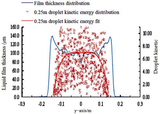 Figure 27 shows the liquid film thickness distribution on the outer plate at the spraying distance of 0.3 m at 16 MPa. The kinetic energy distribution of liquid droplets in the monitoring surface and its fitting curve through 0.25 m from the nozzle are plotted. It can be seen that, within the range of ±0.1 m from the axis, the kinetic energy of droplets and the distribution of liquid film thickness is basically flat, and in the range beyond ±0.1 m from the axis, with the kinetic energy of droplets impacting on the edge of the spraying sector decreases; the liquid film thickness correspondingly shows a rising trend. Therefore, it can be seen that the film thickness and the kinetic energy of the droplet show an inverse correlation.