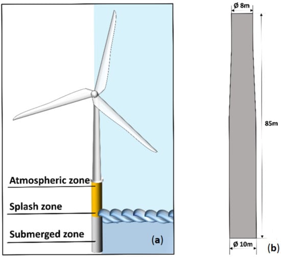 (a) Corrosion zones in an offshore wind generator. (b) Schematics and dimensions of the monopile considered in the study.
