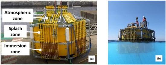(a) The HarshLab 1.0 facility prior to commissioning, prepared to accommodate test panels for field exposure in the atmospheric, splash, and immersion zones. (b) The HarshLab moored in the Cantabrian Sea.