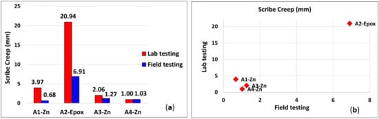As can be seen in Figure 5b, the correlation between the results of scribe creep obtained from laboratory aging and field exposure showed a rather poor correlation. However, the behavior of A2-Epox was consistent and this coating system was the worst performing coating in both the accelerated aging and field testing. This result was expected and is due to the merely organic nature of A2-Epox and the lack of Zn-rich primer, which is essential for the anticorrosion protection of the coating.