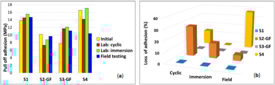 (a) Pull-off adhesion strength of the coatings for the submerged zone before and after laboratory aging and field exposure. (b) Loss of adhesion of the coating systems after aging and field exposure.