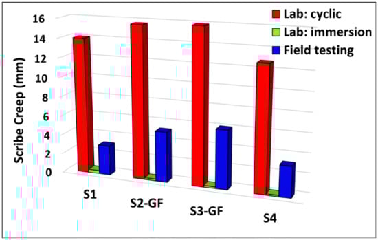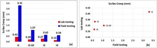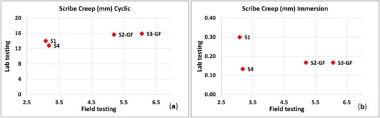 In order to compare the field and laboratory test data, the acceleration factor A using the average value of the scribe creep was calculated according to Equation (1) [10].