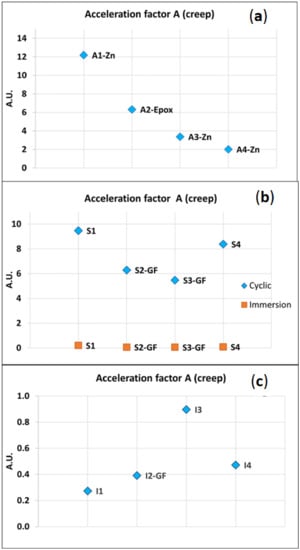 Acceleration factors for the coating systems for the atmospheric zone (a), splash zone (b), and submerged zone (c).
