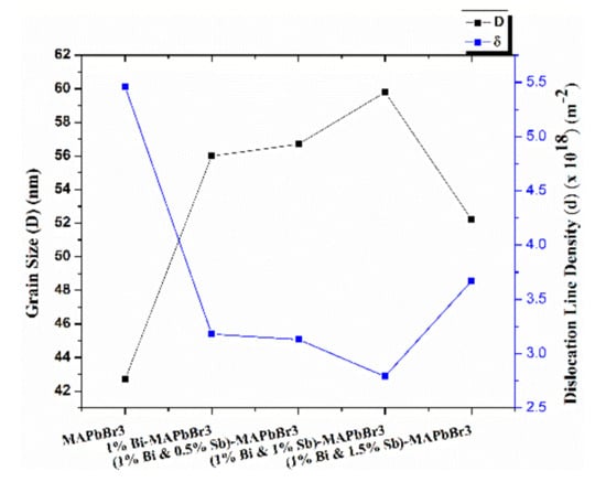 Figure 2 shows the graph of D and δ. The pure MAPbBr3 has grain size 43 nm and dislocation line density 5.5 × 1018 m−2. At 1% Bi doping D increased from 43 to 56.5 nm and δ decreased from 5.5 × 1018 to 3.2 × 1018 m−2. Similarly, at co-doping of 1% Bi along with (0.5%, 1%) Sb, the grain size further increases and δ is decreased. The increment in grain size and reduction in dislocation line density resulted in the improvement in crystallinity at grain side boundaries and also due to the lattice position which is properly held by Bi atoms substitution in the MAPbBr3 film [21]. At co-doping 1% Bi and 1.5% Sb, D is decreased. For the large amount of Sb, free spaces are not available. Therefore, Sb dispersed and reduction in grain size is observed. The low value of D refers to the loss in crystallinity and reduced electrical properties.