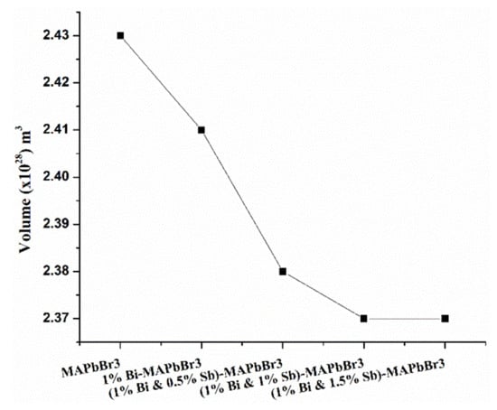 The volume of pure MAPbBr3 and co-doped (1% Bi and 0.5%, 1% and 1.5% Sb)-MAPbBr3.