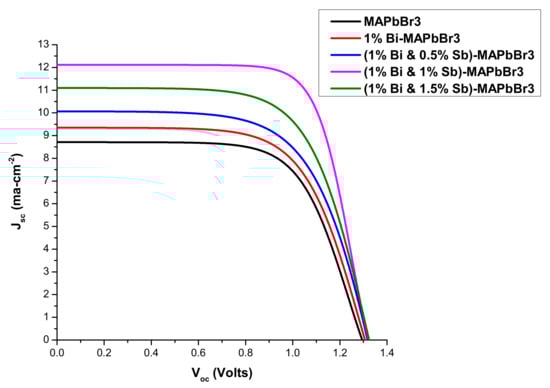J-V curve of pure MAPbBr3 and 1% Bi and (0%, 0.5%, 1%, 1.5%) Sb co-doped MAPbBr3 based solar cells.