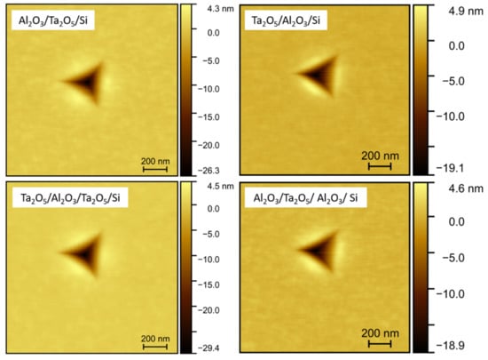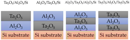 | Al2O3/Ta2O5/Si | 470 × Ta2O5 + 340 × Al2O3 | 34 nm Ta2O5 + 40 nm Al2O3 |