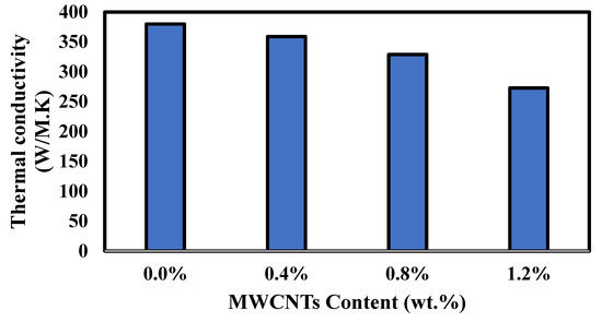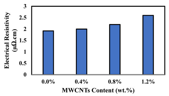 - Electrical resistivity gradually increased by adding MWCNTs to the Cu nanocomposite, while thermal conductivity decreased by increasing MWCNTs in the Cu nanocomposites.