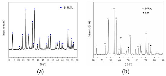 Commercial α-Si3N4 powder with a mean size of 0.40–0.60 μm and 99.99% purity was used to conduct this investigation. hBN powder with a mean size of 0.3 μm and 99.8% purity was used as the second additive phase. Oxide additives of Y2O3 and Al2O3 (mean size of 1 μm and >99.5 purity) were used as sintering aids. Powders were mixed by ball mill (KQM-X4Z/B, Xianyang, China) at 500 rpm for 5 h with zirconia balls to a powder ratio of 2:1 in alcohol for 24 h. After the slurry was dried, the mixed powders were utilized in five Si3N4-hBN composites with 0%, 5%, 10%, 20% and 30% hBN (named as SN0, SN5, SN10, SN20 and SN30) by hot-press sinter of 30 MPa in flowing N2 at 1800 °C for 30 min in an graphite die. Disc specimens with a size of Φ44 mm× 6 mm were then produced. The XRD results of the sintered specimens for Si3N4 and Si3N4-30%hBN are shown in Figure 1, and it can be observed that the pure Si3N4 specimen is composed of β-Si3N4, and that the ceramic composite is composed of β-Si3N4 and hBN. Thus, it can be concluded that the α-Si3N4 raw powder has been completely transformed to β-Si3N4 during the sintering process, and that the hBN powder did not undergo any phase transformation. So, the composite ceramics were composed of β-Si3N4 columnar crystal and hBN sheets. The physical and mechanical properties of the ceramic composites are shown in Table 1, revealing a downtrend in the mechanical performance with the increase in hBN content.