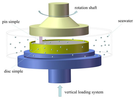 Sliding wear tests were carried out on a MMW-1 pin-on-disc wear tester (made by Jinan Zhongchuang Industrial Test System Co., Ltd., Jinan, China). In this tester, an upper pin contacts a stationary disc when artificial water is supplied to the contact surface, and the wear interfaces are fully immersed in the seawater, as shown in Figure 2. Meanwhile, the artificial seawater (whose salinity is 35 g/L) was prepared according to Standard ASTM D 1141-98.