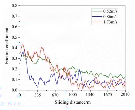 Figure 3 displays the friction coefficients and wear rates of the Si3N4-hBN/PEEK sliding pairs at different speeds in artificial seawater. It can be observed from Figure 3a that the sliding speed exerts a significant effect on the friction coefficient, which is, however, different for Si3N4 ceramics with various hBN contents. In particular, the friction coefficients of the Si3N4-hBN/PEEK pairs decrease with the increase in sliding speed, when the hBN content is in the range from 5% to 20%. Meanwhile, the friction coefficient increases with increasing sliding speed for the SN0/PEEK and SN30/PEEK pairs. Among these sliding pairs, the lowest friction coefficient of 0.07 was obtained at a speed of 1.73 m/s for the SN20/PEEK pair. The corresponding wear rates of the pins and discs present a similar change law (see Figure 3b,c). Meanwhile, all of the wear rates of the pins and discs were less than 10−6 mm3/Nm orders of magnitude. In general, the SN20/PEEK pair presented the best tribological properties at a sliding speed of 1.73 m/s, and Figure 4 shows the change curves of the friction coefficients of the SN20/PEEK pair at different sliding speeds.