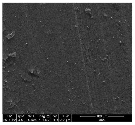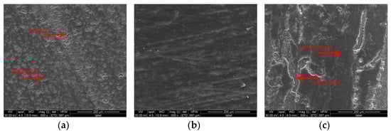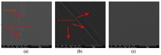 Figure 5 shows the morphologies of the worn surfaces of the PEEK discs sliding against the SN20 pin at the different sliding speeds in seawater. The worn surface of the PEEK disc gradually became smooth with increasing speed. Some wear particles and squamous broken morphologies were observed on the worn surface of the PEEK disc at the speed of 0.52 m/s (Figure 5a). A pronounced furrow morphology was observed on the worn surface of the PEEK disc at the speed of 0.86 m/s (Figure 5b). At the speed of 1.73 m/s, a very smooth worn surface can be observed on the PEEK disc (Figure 5c).