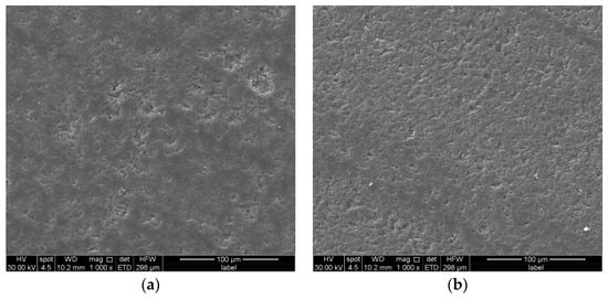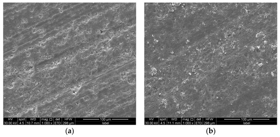 When the SN5 and SN10 pins slide against the PEEK disc in seawater, the variation in friction and wear behavior with speed is similar to that of the SN20/PEEK pair. Rough worn surfaces of the SN10 and SN5 pins at a speed of 0.52 m/s can be observed, as shown in Figure 10a and Figure 11a, while the relatively smooth surfaces at a speed of 1.73 m/s can be clearly observed in Figure 10b and Figure 11b. So, for these pairs, the increase in speed promoted the progress of tribochemical reactions and inhibited the degree of mechanical meshing. However, when the hBN content reached 30 wt.%, serious degradation of the mechanical properties led to a very rough wear surface during the friction process. In this case, the mechanical meshing was unavoidable, even when the friction pair was cooled and lubricated by seawater, so friction is the combination of mechanical meshing and molecular resistance. Thus, the friction coefficients of the SN30/PEEK pair were higher than those of SN20/PEEK. Moreover, an increase in speed aggravated the fracture and spalling of the ceramic pins and mechanical meshing, so the friction coefficient and wear rate of the SN30/PEEK pair increased with increasing speed.