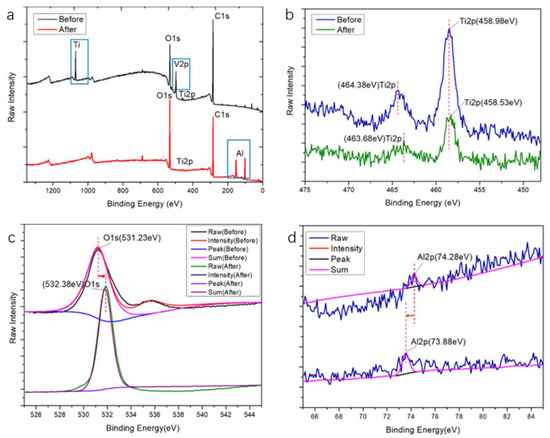 Figure 2a,b show the survey XPS spectrum and Ti2p XPS spectrum of the samples, respectively [30]. There are three obvious peak changes on the sample surface before and after processing. The binding energy peaks near 1090 eV and 500 eV decreased greatly after processing, while two peaks increased greatly near 100 eV and 150 eV. Figure 2c,d show the O1s and Al2p XPS spectra of the samples [31]. After processed by femtosecond laser, the peak intensity of oxygen increased significantly from 108,458 eV to 145,100 eV, and the impurity peak in the XPS spectrum of O1s disappears. Combined with the diagram of Al2p, we can know that the peak intensity of Al decreases from around 4500 eV to around 2500 eV.
