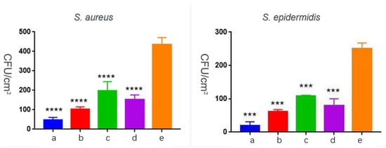 Figure 5. S. aureus and S. epidermidis growth on samples with different coatings after 6 h incubation. Data represent mean ± SD, N = 4. *** p < 0.001, **** p < 0.0001 compared with Ti control. Notes: (a) groove pattern; (b) micro-hole pattern; (c) directional grain pattern; (d) stripe pattern (e) control group.