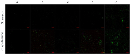 Figure 6. CLSM images of S. aureus and S. epidermidis colonies on samples with different coatings after 6 h incubation. Notes: (a) groove pattern; (b) micro-hole pattern; (c) directional grain pattern; (d) stripe pattern (e) control group. Abbreviations: CLSM, confocal laser scanning microscopy.