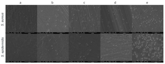 Figure 7. SEM images of S. aureus and S. epidermidis colonies on samples with different coatings after 6 h incubation. Notes: (a) groove pattern; (b) micro-hole pattern; (c) directional grain pattern; (d) stripe pattern (e) control group. Abbreviations: SEM, scanning electron microscopy.