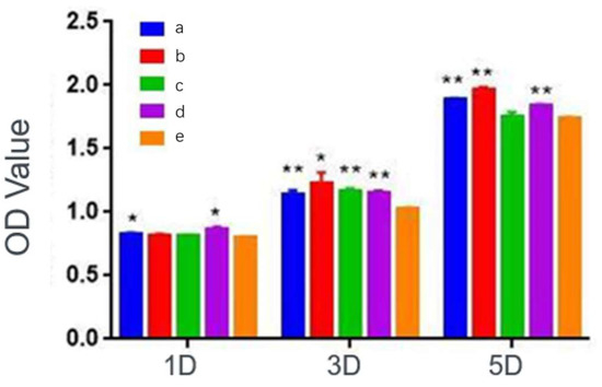 Figure 8. OD value after 1, 3, and 5 days of culture with bone marrow mesenchymal stem cells (BMSC). Notes: (a) groove pattern; (b) micro-hole pattern; (c) directional grain pattern; (d) stripe pattern (e) control group. Abbreviations: OD, optical density, * p < 0.1, ** p < 0.01.