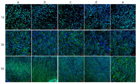 To estimate the cell adhesion and proliferation on the microtopography-coated sample, CLSM was used to observe the number and morphology of the cells (Figure 9). The cell skeleton showed green fluorescence stained by FITC and the cell core showed blue fluorescence stained by DAPI. After incubation for 1d, viable BMSC appeared on all sample surfaces after incubation, the number of viable cells increased predominantly after incubation for 3 d and further became enormously larger 5d later. Furthermore, the well extended and elongated cytoskeleton was observed obviously on all sample surfaces after incubation for 3 d and 5 d.