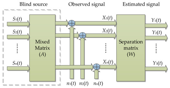RobustICA algorithm is proposed by Zarzoso et al. [29,30]. Because the observation data used in it does not need whitening preprocessing, it can only meet the condition that its mean value is zero, so the problem of introducing error is avoided. The algorithm realizes the kurtosis optimization by using linear search and algebraic calculation of the global optimal step size. The frame of independent component analysis is shown in Figure 1 [31]. Assuming that the mixed data containing noise is X and the output signal is Y = WX, the kurtosis formula can be expressed as follows: