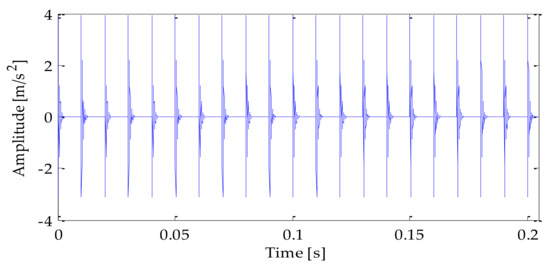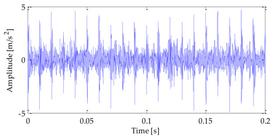 Bearing is one of the most commonly used general parts in all kinds of rotating machinery. It plays a role in bearing and transmitting load in mechanical equipment, and it is very prone to failure. Therefore, to verify the performance of the algorithm proposed in this paper, a typical model was used to simulate the periodic impact signal caused by bearing fault [32]. Firstly, a set of periodic pulse signals was simulated to simulate the fault impact signal, and on this basis, Gaussian white noise was added to the fault impact signal to simulate the bearing fault vibration signal polluted by environmental noise. In this study, Matlab (version R2009a) was selected as the vibration signal modeling and simulation software to build the signal model. The expression of the simulated signal is as follows: