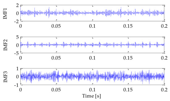 Next, we performed VMD decomposition on the mixed signal. After VMD decomposition optimized by information entropy, three IMF components were obtained. The decomposition results are shown in Figure 9. In order to compare the effects of different methods, the traditional LMD decomposition method, EMD decomposition method, and EEMD decomposition method were used for the time–frequency analysis of mixed signals. The signal decomposition results obtained based on the above three methods are shown in Figure 10a,b. Figure 10 and Figure 11 showed that there were more signal components decomposed by LMD, EMD and EEMD methods, and the signal components obtained by EMD and EEMD had certain modal aliasing and endpoint effect. At the same time, faultycomponents were generated.