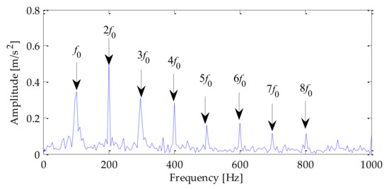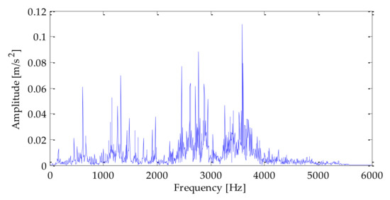 By processing the collected signal, the time domain waveform and frequency domain waveform of the fault signal of the inner ring of the rolling bearing are shown in Figure 21 and Figure 22 can be obtained. It can be seen from that the noise interference in the signal was relatively small, and the fault impact characteristics were prominent. To test the method’s effectiveness, SNR = −2 dB white Gaussian noise was added to the inner ring fault signal in this experiment. The time–domain waveform and frequency–domain waveform of the finally mixed signal is shown in Figure 23 and Figure 24, respectively.