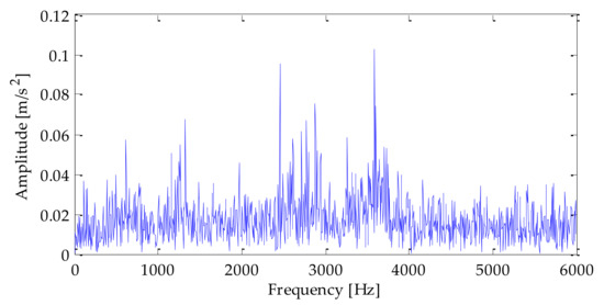 By extracting the rolling bearing outer ring fault signal data, the time domain waveform and frequency domain waveform of the outer ring fault signal is shown in Figure 33 and Figure 34. Similarly, SNR = −2 dB white Gaussian noise was added to the inner ring fault signal in this experiment to test the method’s effectiveness.The time domain waveform and frequency domain waveform of the finally obtained mixed signal are shown in Figure 35 and Figure 36. Due to noise interference, it wasnot easy to distinguish the impact features from the diagram. Next, the signal was further processed.