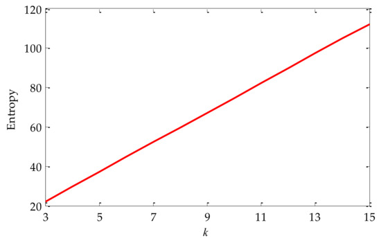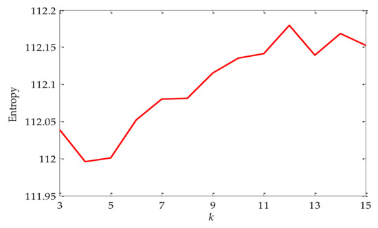 Since the mixed signal was severely interfered with by noise, next, the signal will be decomposed by VMD. Before VMD decomposition, information entropy must be used to optimize VMD to determine the parameters k and α in VMD. Firstly, our experiment used the default value a, which was 2500. Meanwhile, we initialized k = 3, and the search range of k was set to [3,15]. The value of optimal mode k was searched according to the principle of minimum envelope spectral entropy. The relationship between k and envelope spectral entropy is shown in Figure 7. From the transformation trend of the value of k in the figure, it can be seen that with the increasing value of k, the corresponding envelope spectral entropy was also increasing. Therefore, k = 3 was taken as the optimal value.