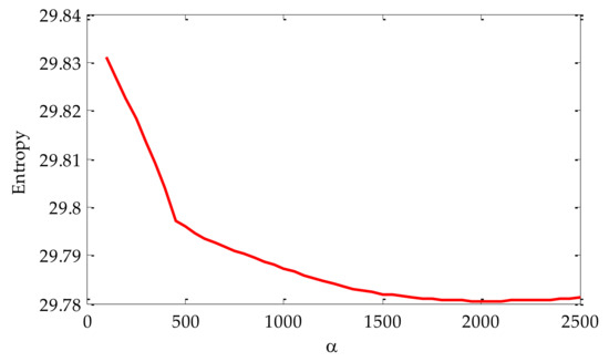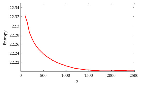 After selecting the value of the optimal mode K, the value of α was then initialized. The search range was set to [100, 2500]. Similarly, the value of the optimal mode α was searched according to the principle of minimum envelope spectral entropy. The relationship with envelope spectral entropy is shown in Figure 8. From the transformation trend of the value of α in the figure, it can be seen that with the continuous increase of α, the value of the corresponding envelope spectral entropy was decreasing and gradually tends to be flat. When the value of α was 2500, the optimal value can be obtained. Therefore, after parameter optimization, the selected optimal parameter combination K and α was [3, 2500].